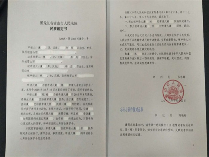 密山法院工作人员在了解情况后,非常重视,第一时间约谈了双方当事人,并对情况进行了进一步的核实,并且于2018年10月16日进行了开庭审理,在庭审过程中,根据《未成年人保护法》、《反家庭暴力法》等的相关规定,对被告廉某及其母亲林某的行为作出训诫,并根据黑龙江省妇女联合会、黑龙江省公安厅、黑龙江省高级人民法院联合下发的《关于贯彻落实家庭暴力告诫制度的工作意见》的通知,对廉某某发出密山市人民法院首列“人身安全保护令”民事裁定书,禁止廉某、林某对廉某某实施家庭暴力,并向申请人和被申请人发放了人身安全保护令核发后注意事项。