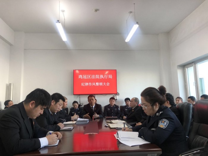 2月13日下午,为严肃纪律作风,规范执行行为,鸡冠区法院执行局召开“执行纪律作风”整顿会议。根据党组书记、院长马宝君在“深化机关作风整顿营商环境”工作推进会上讲话精神,对当前执行工作重点及队伍建设中存在的问题进行深入剖析。执行局全体干警参加会议,副院长李长钢主持会议。