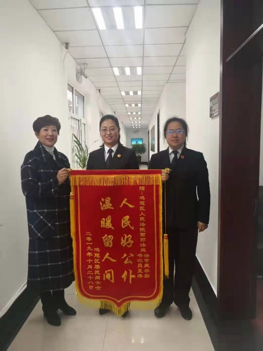 2019年10月28日,当事人周某拿着锦旗,走到鸡冠区法院西郊法庭副庭长庞学勤办公室前,人未进屋声先到: “庞法官,我的案件能解决了真多谢你和夏同志了,我都不知道怎么感谢你们好了,给送了个锦旗,你们一定要收下啊”。