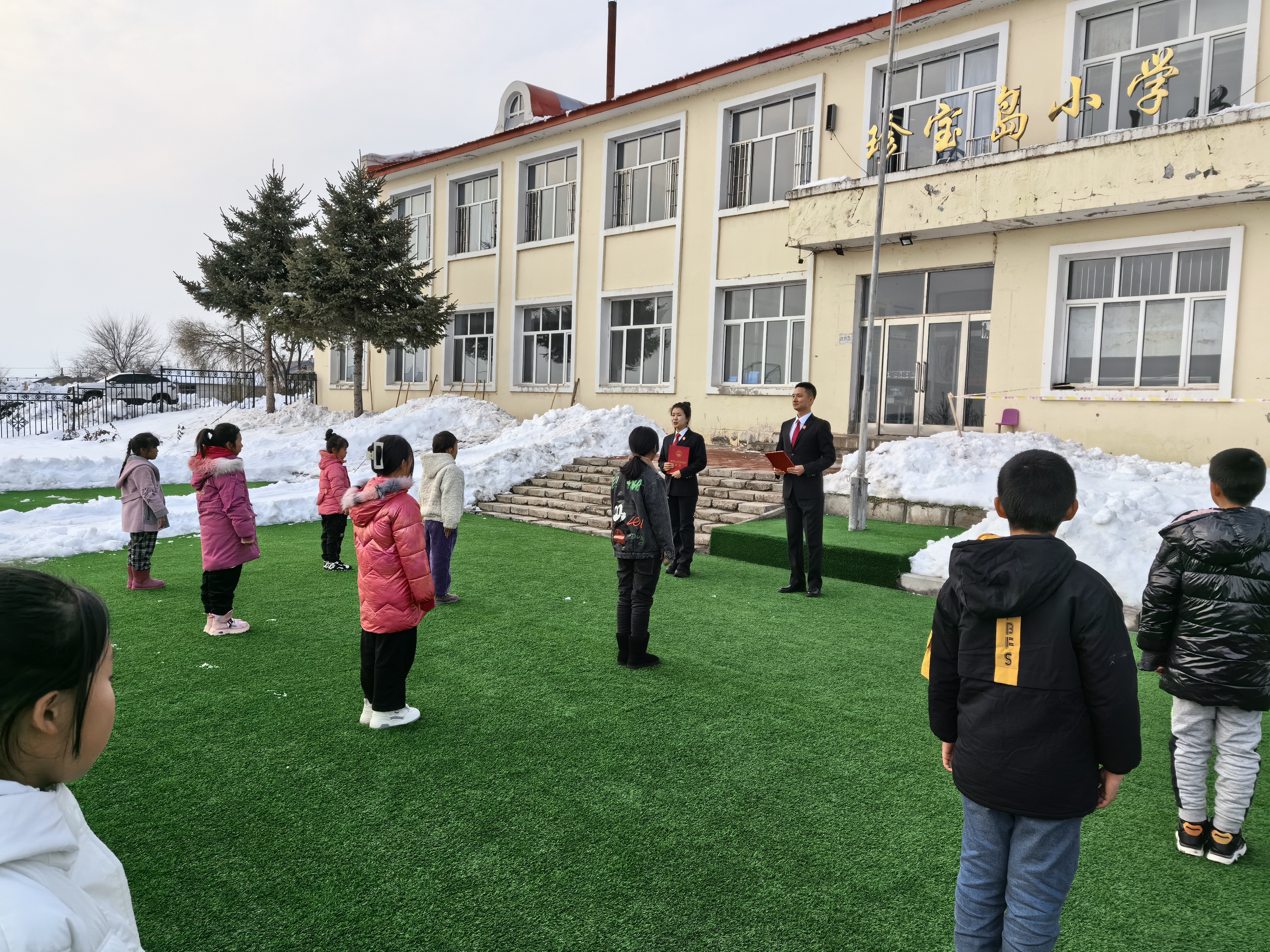 在另一所边境学校珍宝岛小学,鸡西法院的干警们与全校师生共同举行了升国旗仪式,法官与孩子们在鲜艳的国旗下合影,为他们讲解宪法知识并送去学习用品。
