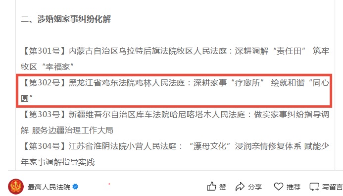 鸡东法院鸡林人民法庭案例:深耕家事“疗愈所” 绘就和谐“同心圆”,入选新时代人民法庭建设案例。