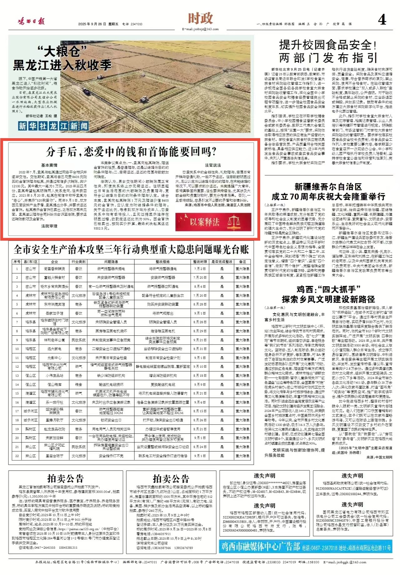 为让法治精神更贴近百姓生活,让法律条文从“纸上”走向“身边”,《鸡西日报》推出“以案释法”专栏,依托真实案例,聚焦社会关切的法律议题,以专业视角深入解析,致力实现“审理一案、教育一片”的警示效果。鸡西中院同步转发《鸡西日报》典型案例,用群众听得懂的语言、看得见的 “身边事”,解开法律 “密码”。