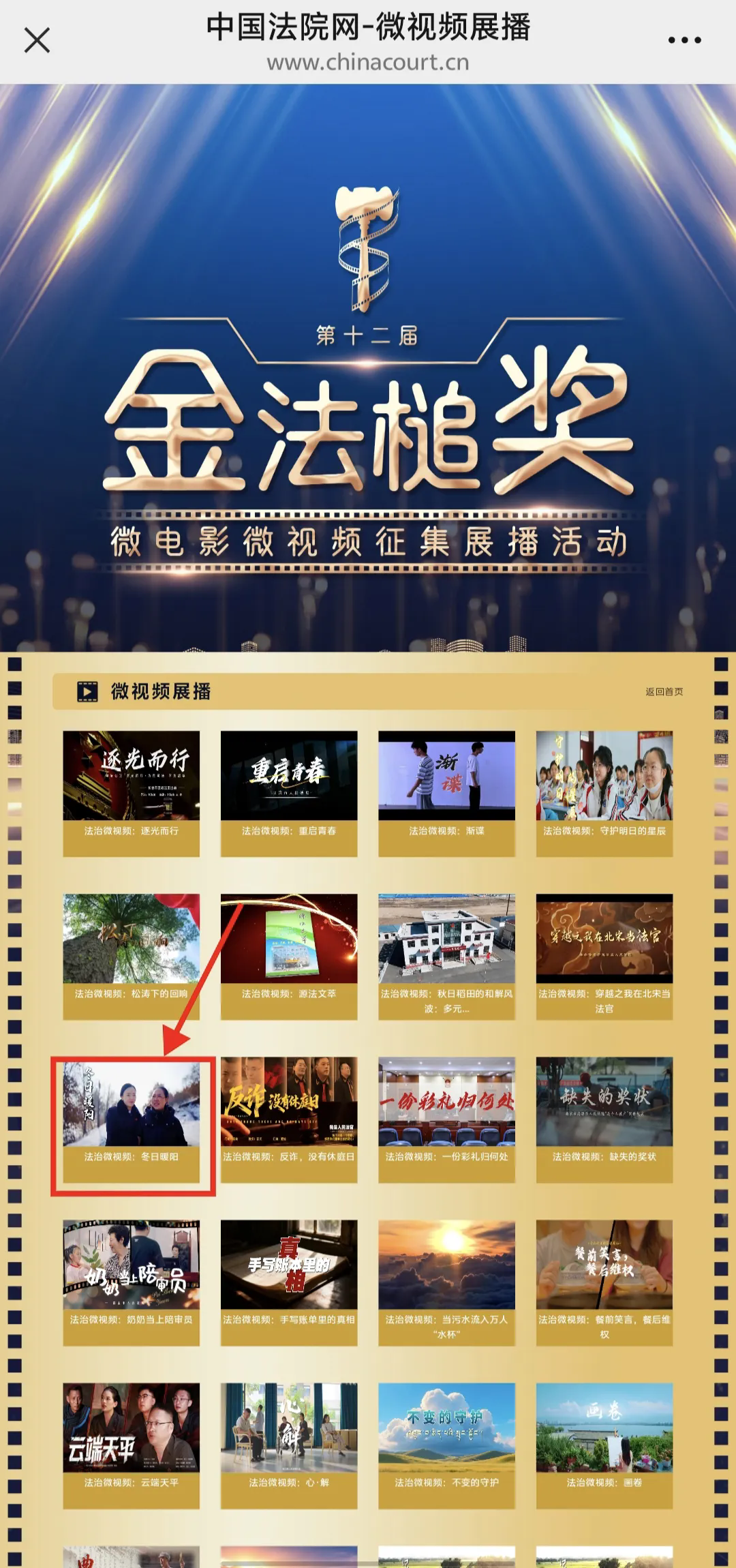 第十二届“金法槌奖”微电影微视频征集展播活动来啦!麻山法院首部原创法治微视频《冬日暖阳》正在中国法院网展播。这部以"小院法庭"真实案例为蓝本的作品,用镜头语言讲述基层司法故事,将法律的温度与人性的温暖融入光影之间,成为展现新时代人民法院司法为民初心的生动注脚。