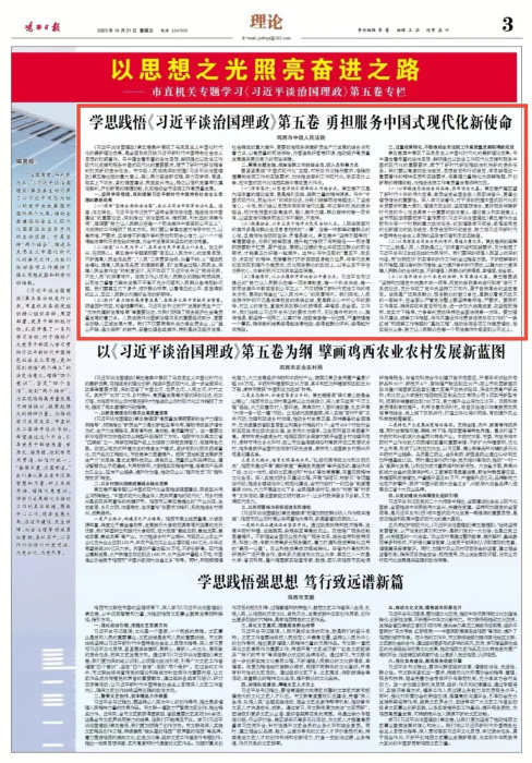 (一)深学笃行,以思想淬炼引领审判工作结合点。第五卷不仅是内涵丰富的理论宝库,更是指引实践、凝聚力量的精神源泉。书中“中国式现代化,民生为大”的深刻论述,为我们破解司法难题注入了坚定信心。今后,我们会以思想淬炼筑牢信仰之基,牢记审判机关的使命担当,把许党报国的崇高追求,融入案件办理、群众接待的每一项日常,以坚定信仰确保司法工作不偏航、不走样。