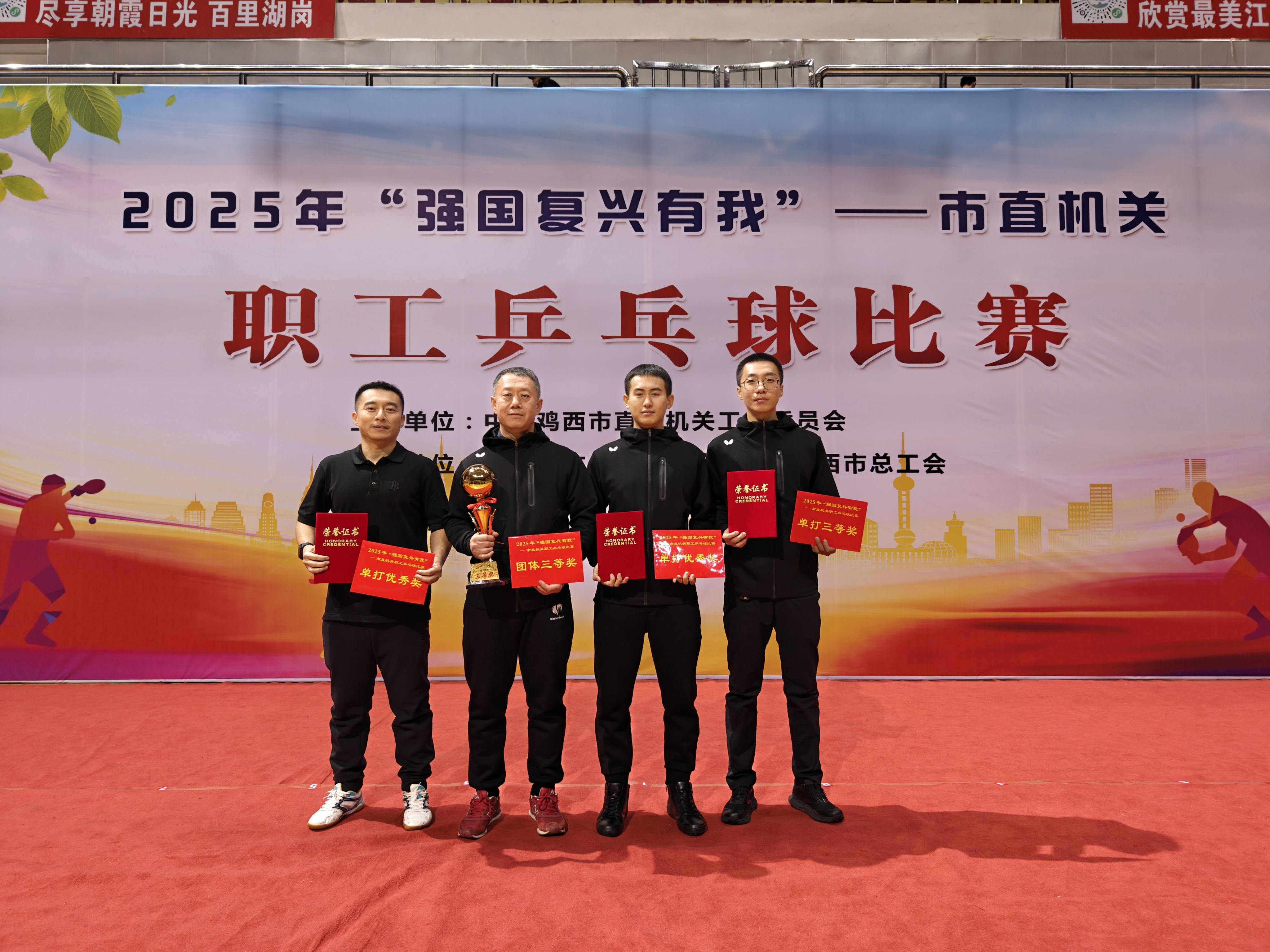 2025年11月15日至16日,以“强国复兴有我”为主题的市直机关职工乒乓球比赛在市会展中心隆重举行。来自各市直单位的代表队齐聚一堂,展开了为期两天的激烈角逐。鸡西法院代表队在此次比赛中团结协作、奋勇拼搏,凭借出色表现荣获团体三等奖,队员佟征荣获男子单打三等奖,王洪福、徐枭博荣获男子单打优秀奖,充分展现了鸡西法院人昂扬向上的精神风貌和锐意进取的奋斗姿态。