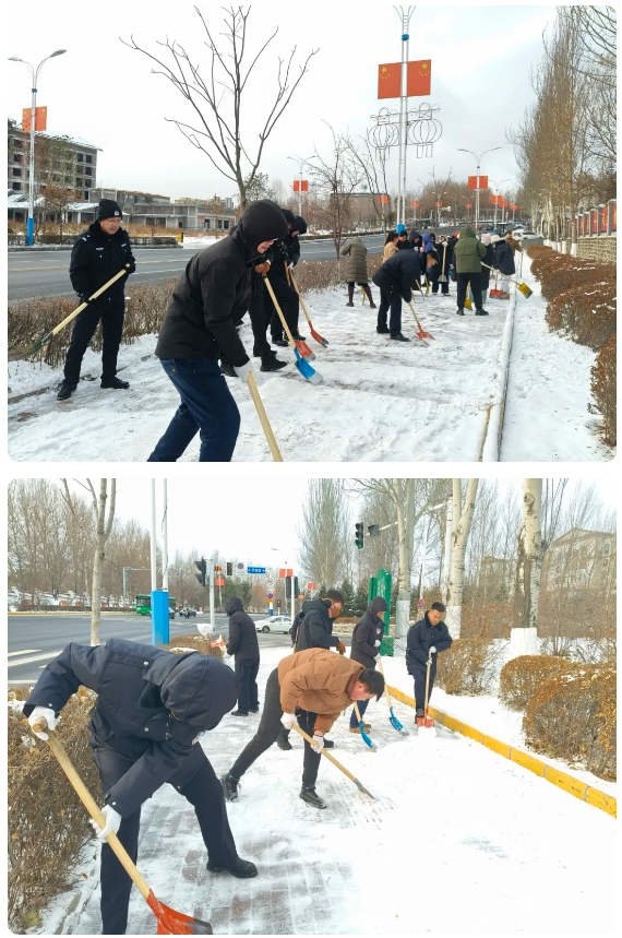 降雪后寒气袭人,干警以雪为令、迅速行动,你拿铁锹,他拿雪铲,天虽然冷,但丝毫没有影响干警们的热情,推的推、铲的铲,干得热火朝天、细致有序,对已被碾压结实的雪块,用铁锹砸碎并清扫装运。经过一个多小时的清扫,人行路上的积雪被铲除、清扫干净,给居民出行创造了安全整洁的环境。活动中干警以实际行动践行初心、担当使命,劳动热情让“志愿红”在一片白茫茫中显得格外夺目。