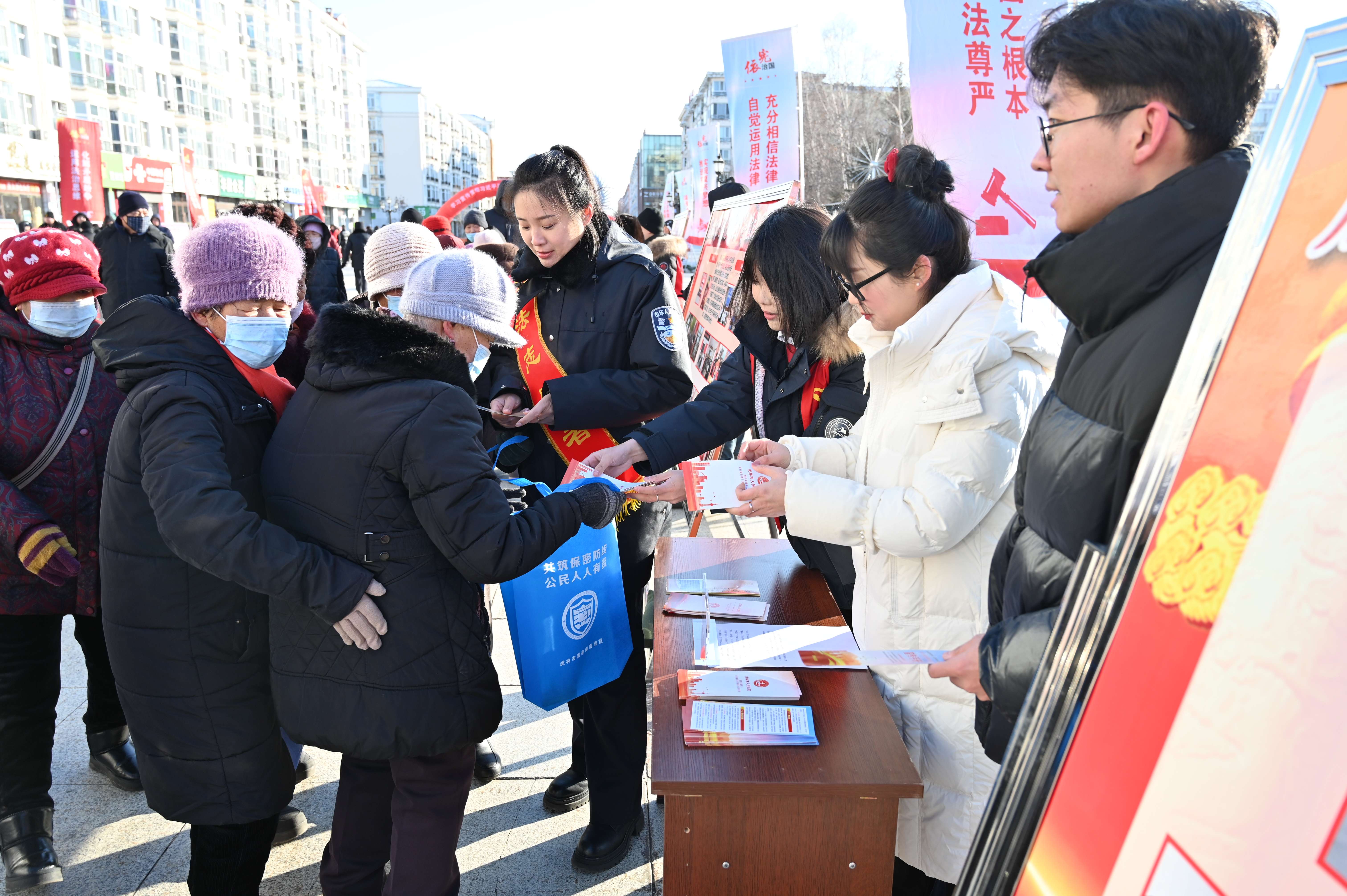 鸡西中院邀请市直单位以及各区司法局的54名国家机关工作人员走进法庭旁听庭审,用以案释法的方式精准普法。麻山法院走进集市普法,滴道法院在区政府广场设立咨询台,城子河法院在兴城、虎林法院在吉祥广场分别设立咨询台开展现场普法咨询活动。梨树法院设立宣传台发放材料,解答群众法律疑问。密山法院裴德法庭踏雪进村,将法律送到村民“热炕头”,现场化解纠纷2起。