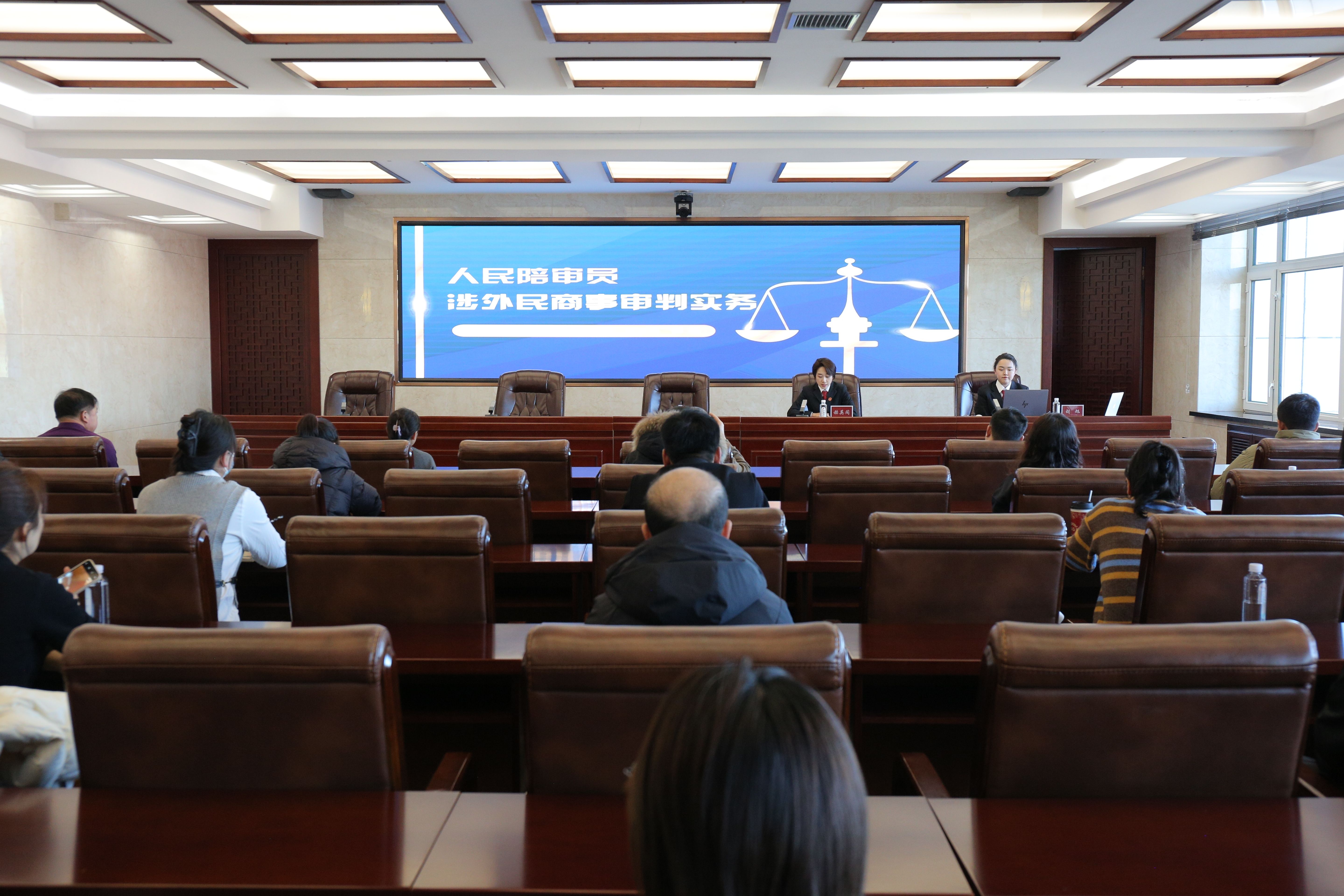 本次培训由民三庭副庭长赫英阁主持,法官助理胡旭主讲,旨在锻造一支既懂国情又具国际视野的高素质人民陪审员队伍。来自全市两级法院的40余名人民陪审员代表参加了本次培训。
