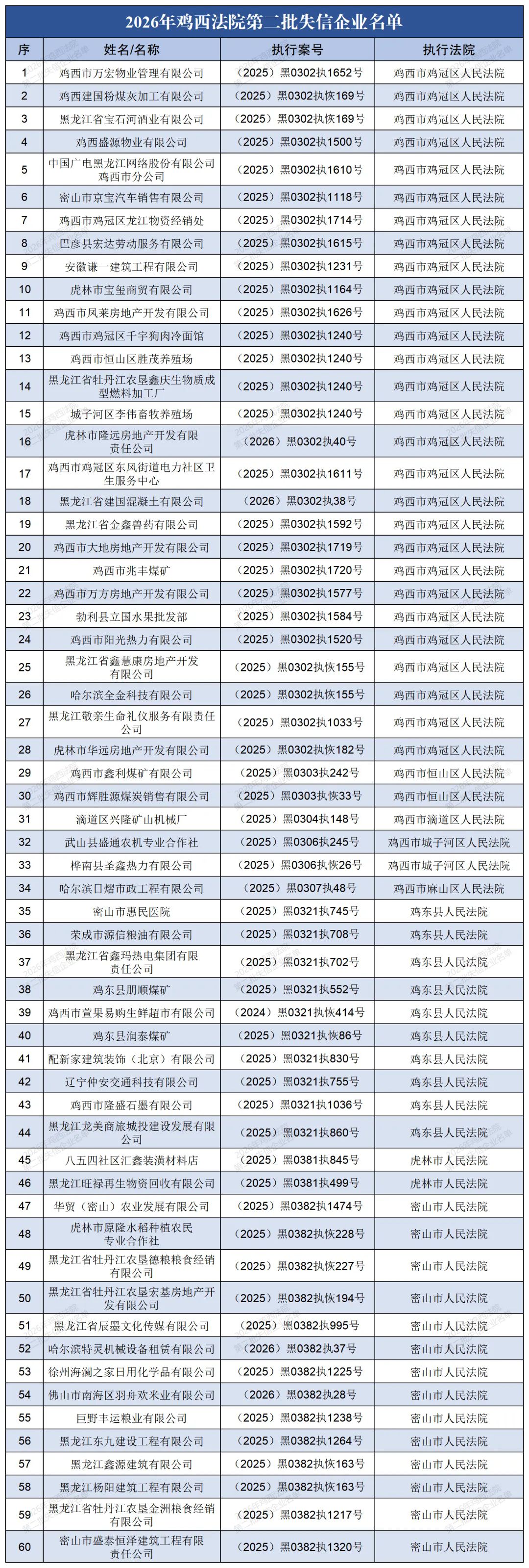 【失信曝光】2026年鸡西法院第二批失信企业名单