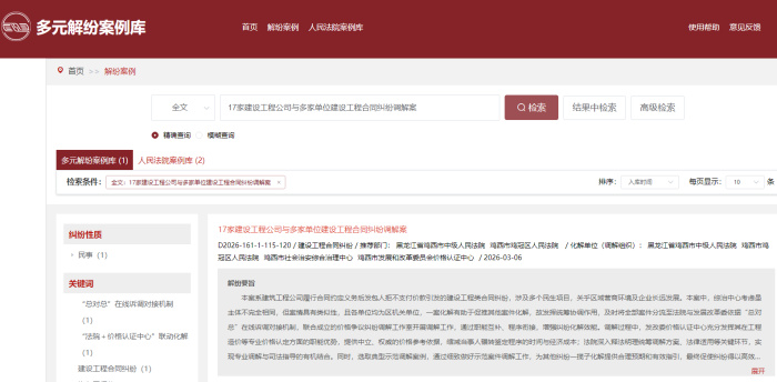 近日,在鸡西市中级人民法院精心指导、严格把关下,由鸡冠区人民法院编报的《17家建设工程公司与多家单位建设工程合同纠纷调解案》,经过上级法院层层审核、选送、推报,成功入选最高法院多元解纷案例库(入库编号:D2026-161-1-115-120)。系鸡西法院第三篇入选最高人民法院多元解纷案例库的典型案例,为同类纠纷的高效妥善处理提供了有益借鉴和实践参考。