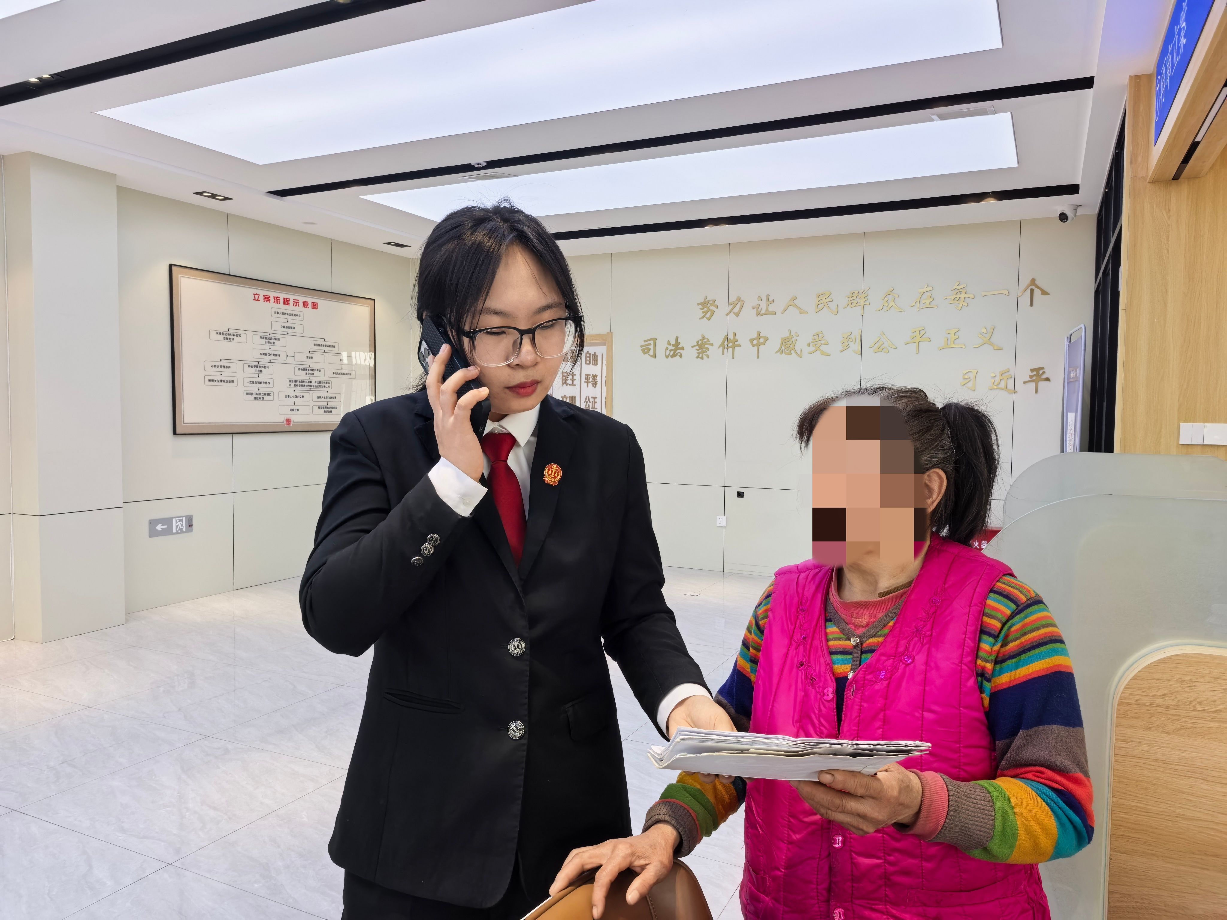 考虑到老人年事已高、路途遥远,李鑫积极践行优化诉讼服务要求,开通“适老服务”绿色通道,压缩办理时限、简化办理流程,1小时便完成全部立案手续。全程温和细致、贴心周到的服务,让老人在繁琐的程序中真切感受到司法的尊重与温度。