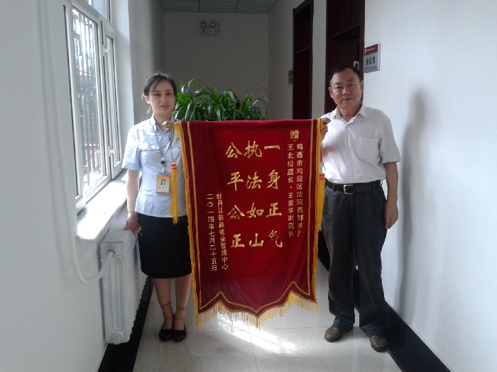 2014年8月4日上午,牡丹江铁路物业管理中心给鸡西市鸡冠区法院西郊法庭庭长王北松、副庭长王爱华送来一面上书“一身正气、执法如山、公平公正”的锦旗,以感谢西郊法庭的法官在一起财产损害赔偿案件中秉公执法。