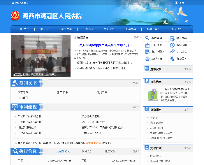 鸡冠区法院诉讼服务网包括法院要闻、法院公告、裁判文书、审判流程、执行信息、庭审视频、指导性案例、诉讼服务等八个模块。公开了法院管辖、机构信息、审判人员名册、便民措施、法院地址以及交通路线、投诉电话等信息,提供了文书样式、诉讼指南、法规查询、诉讼工具等服务。